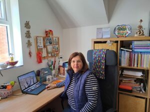 Centre stage is my lovely laptop with its two screens. One is usually displaying research sites and email tabs, the other Word documents — my current WIP.